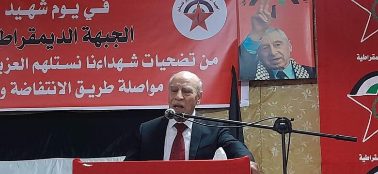 كما تحدث نائب رئيس المجلس الوطني الفلسطيني وعضو المكتب السياسي للجبهة الديمقراطية علي فيصل فقال: ان تخصيص يوم لشهيد الجبهة الديمقراطية هو بهدف ابقاء جذوة المقاومة متقدة طالما بقيت ارضنا محتلة من عدو لن يستجيب حقوقنا الوطنية الا من خلال المقاومة والصمود والوحدة والشراكة مع كافة المكونات الوطنية كوننا حركة تحرر وطني اولويتها يجب ان تظل مقاومة الاحتلال لطرده من فوق ارضنا وممارسة شعب فلسطين لحقوقه الوطنية كاملة في دولة مستقلة عاصمتها القدس وعودة اللاجئين..