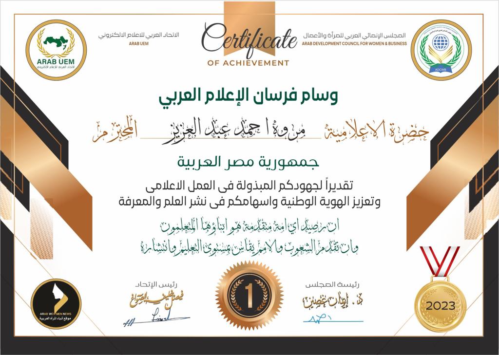 وتمثل التكريم بمنح ١٠٠ اعلامي عربي من بينهم مروة عبد العزيز قناه النيل للرياضة شهادات تقديرية هي عباره عن وسام فرسان الاعلام العربي تقديرا لجهودهم المبذولة في العمل الاعلامي العربي وتعزيز الهوية الوطنية واسهامهم في نشر العلم والمعرفة.