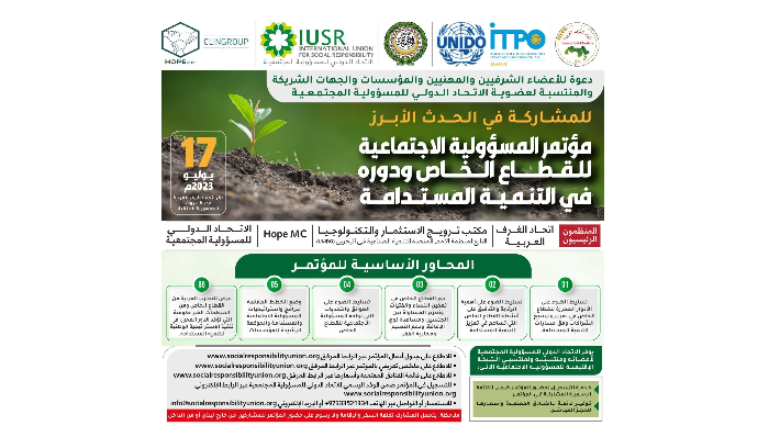 ينظم اتحاد الغرف العربية، بالتعاون مع منظمة HOPE MCF ومكتب ترويج الاستثمار والتكنولوجيا التابع لمنظمة الأمم المتحدة للتنمية الصناعية في البحرين ((UNIDO والاتحاد الدولي للمسؤولية المجتمعية، مؤتمر “المسؤولية الاجتماعية للقطاع الخاص ودورها في التنمية المستدامة”، في مقر اتحاد الغرف العربية في مدينة بيروت، وذلك يوم الإثنين الواقع فيه 17 تموز الحالي، في التاسعة والنصف صباحاً.