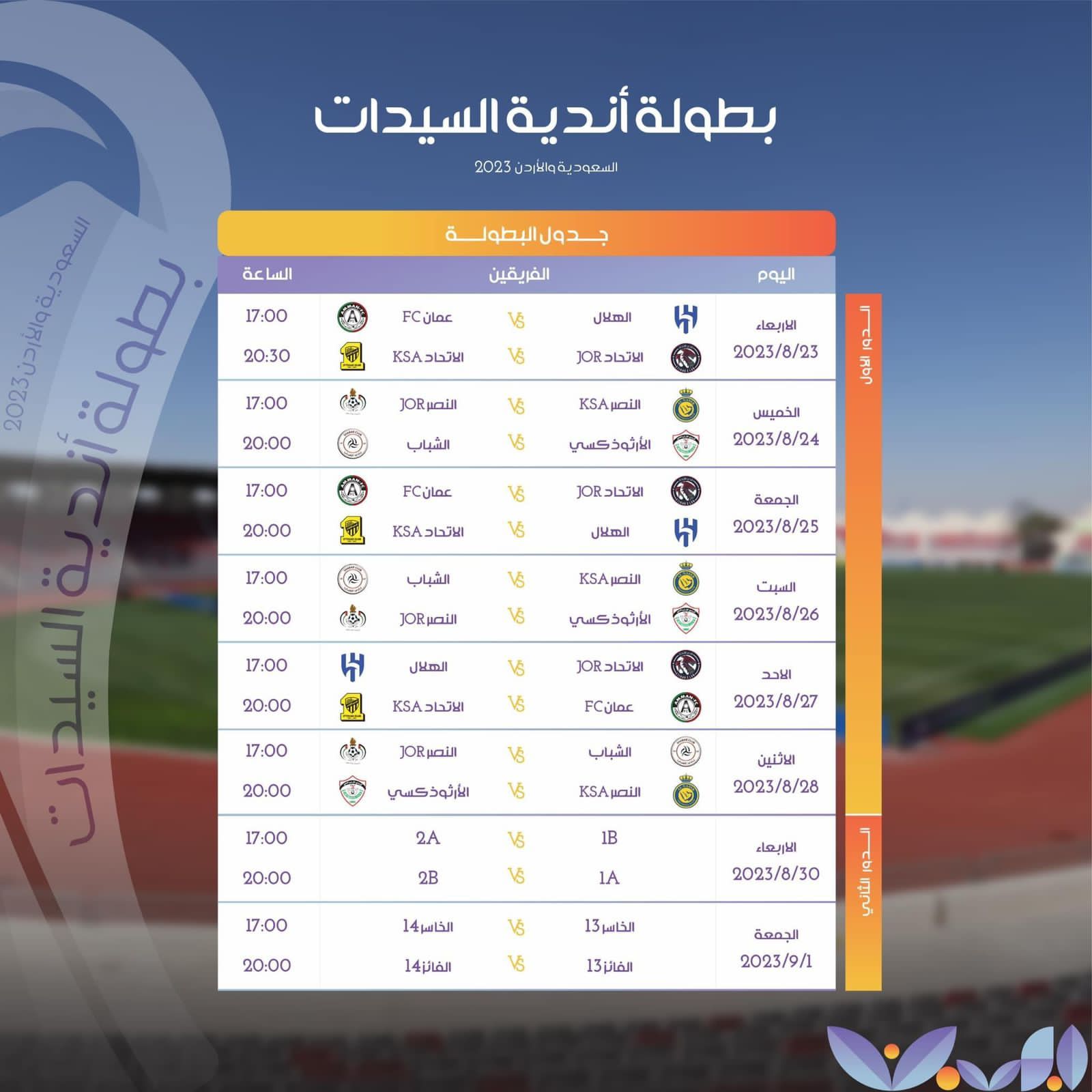 وتبدأ منافسات البطولة عند الخامسة عصر الأربعاء 23 آب الجاري، بمواجهة الهلال السعوي مع عمان FC الاردني على أن يقام حفل افتتاح البطولة عند الثامنة مساءً، ليعقبه مواجهة فريق الاتحاد الاردني مع نظيره الاتحاد السعودي.