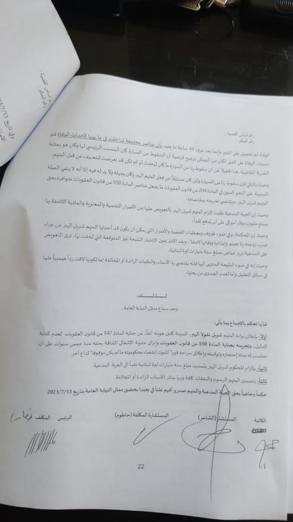 كما جاء في الحكم إلزام المحكوم شربل البير بتسديد مبلغ 6 مليارات ليرة لبنانية نقداً إلى المدعية تريز عيّاض، بالإضافة إلى تغريم المتهم الرسوم والنفقات كافة، وردّ سائر الأسباب الزائدة أو المخالفة.