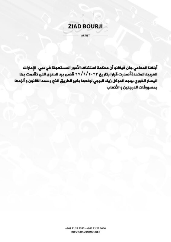 صدر اليوم عن محكمة استئناف الأمور المستعجلة في دبي قرار قضى برد الدعوى التي تقدمت بها السيدة اليسار خوري (الفنانة أليسا) بوجه الفنان زياد برجي لرفعها بغير الطريق الذي رسمه القانون وألزمها بمصروفات الدرجتين والأتعاب، حسب ما أبلغ المحامي جان قيقانو إدارة أعمال برجي.