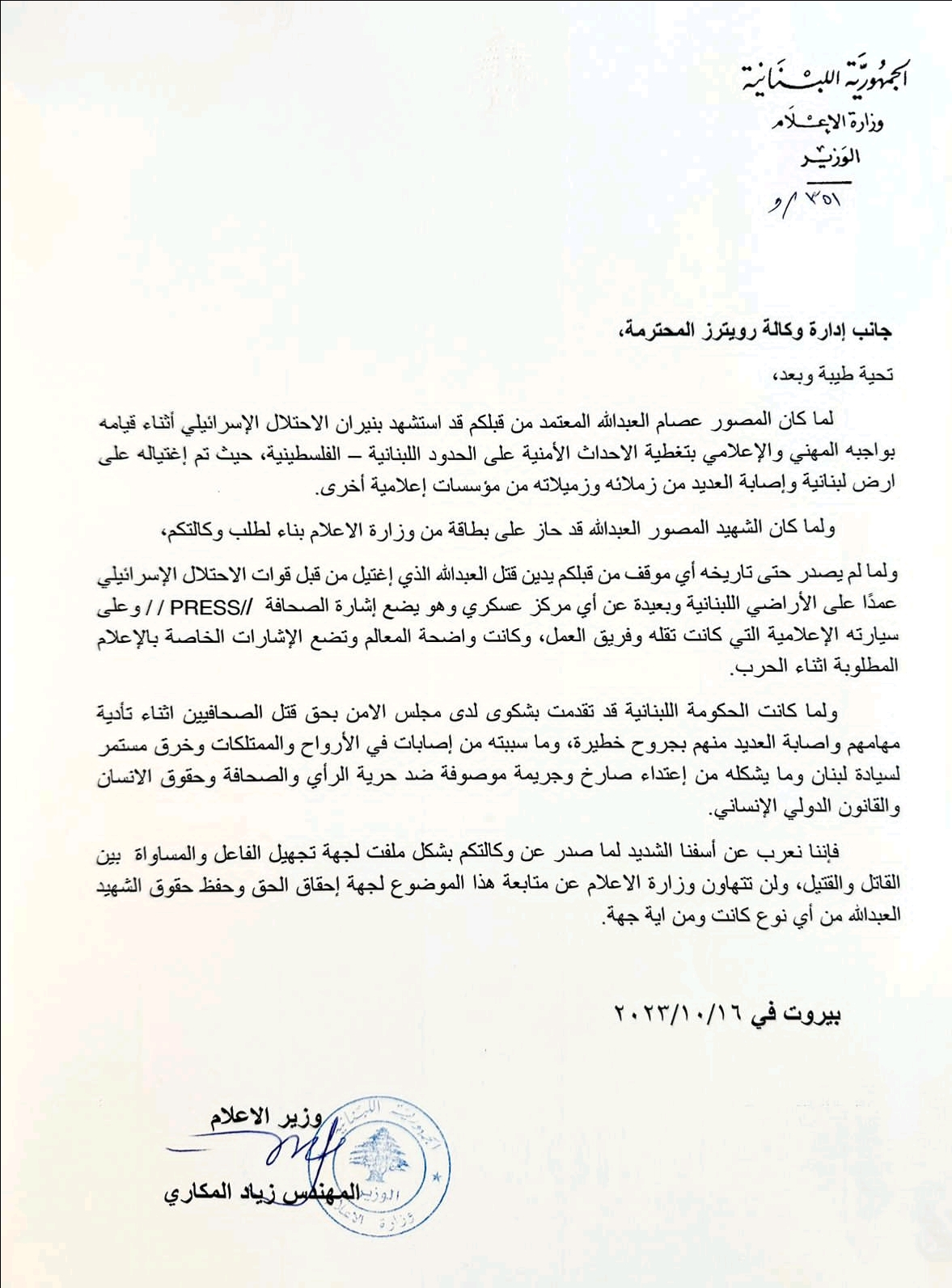 وجه وزير الاعلام في حكومة تصريف الاعمال زياد المكاري كتابين الى كل من وكالتي “رويترز” والصحافة الفرنسية، أعرب فيهما عن أسفه “الشديد لما صدر عنهما بشكل ملفت، لجهة تجهيل قاتل المصور عصام عبدالله وجرح المراسلة كريستينا عاصي التي أصيبت بنيران الاحتلال الاسرائيلي على الحدود اللبنانية الفلسطينية، ولجهة المساواة بين القاتل والقتيل”.