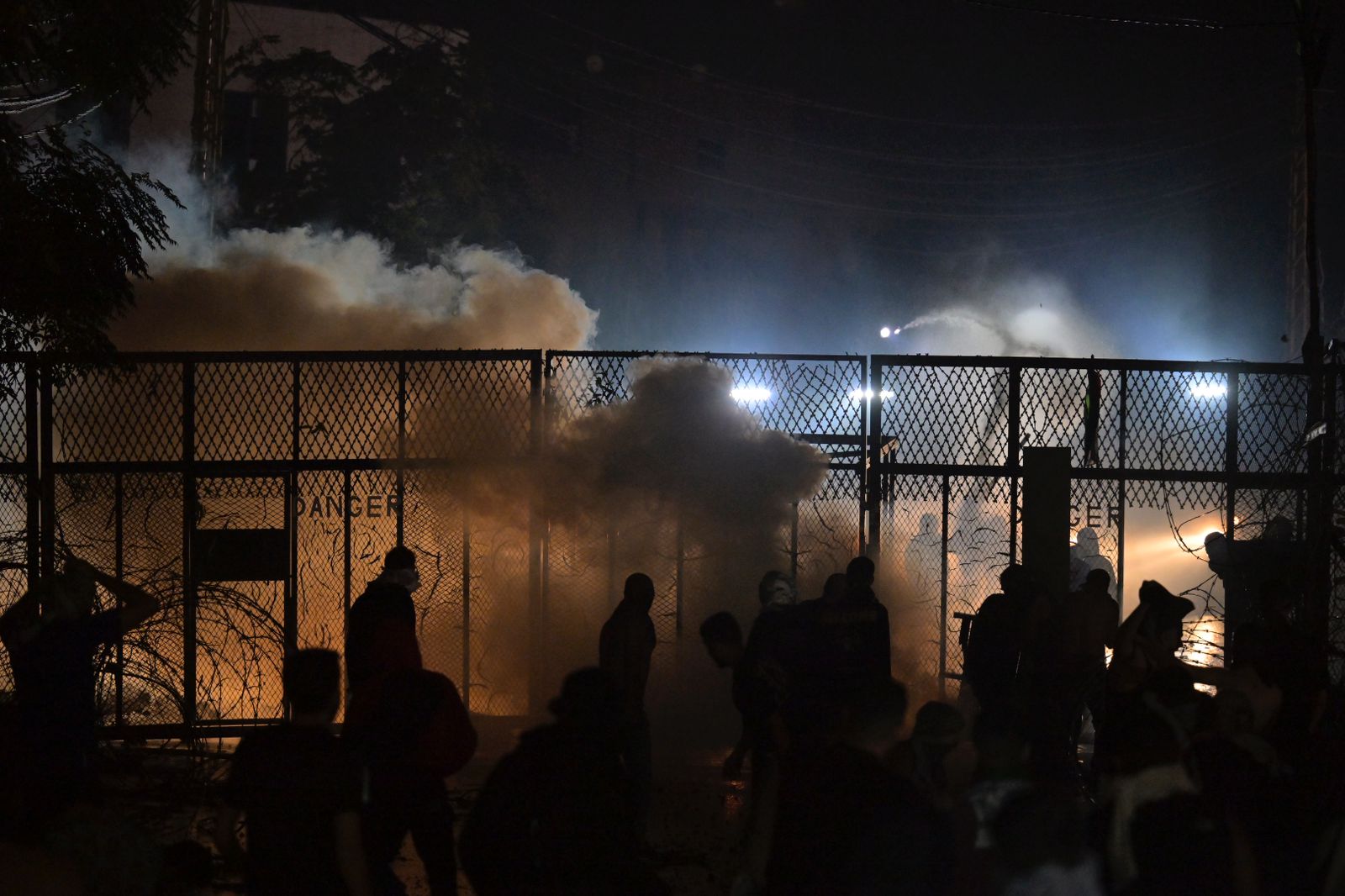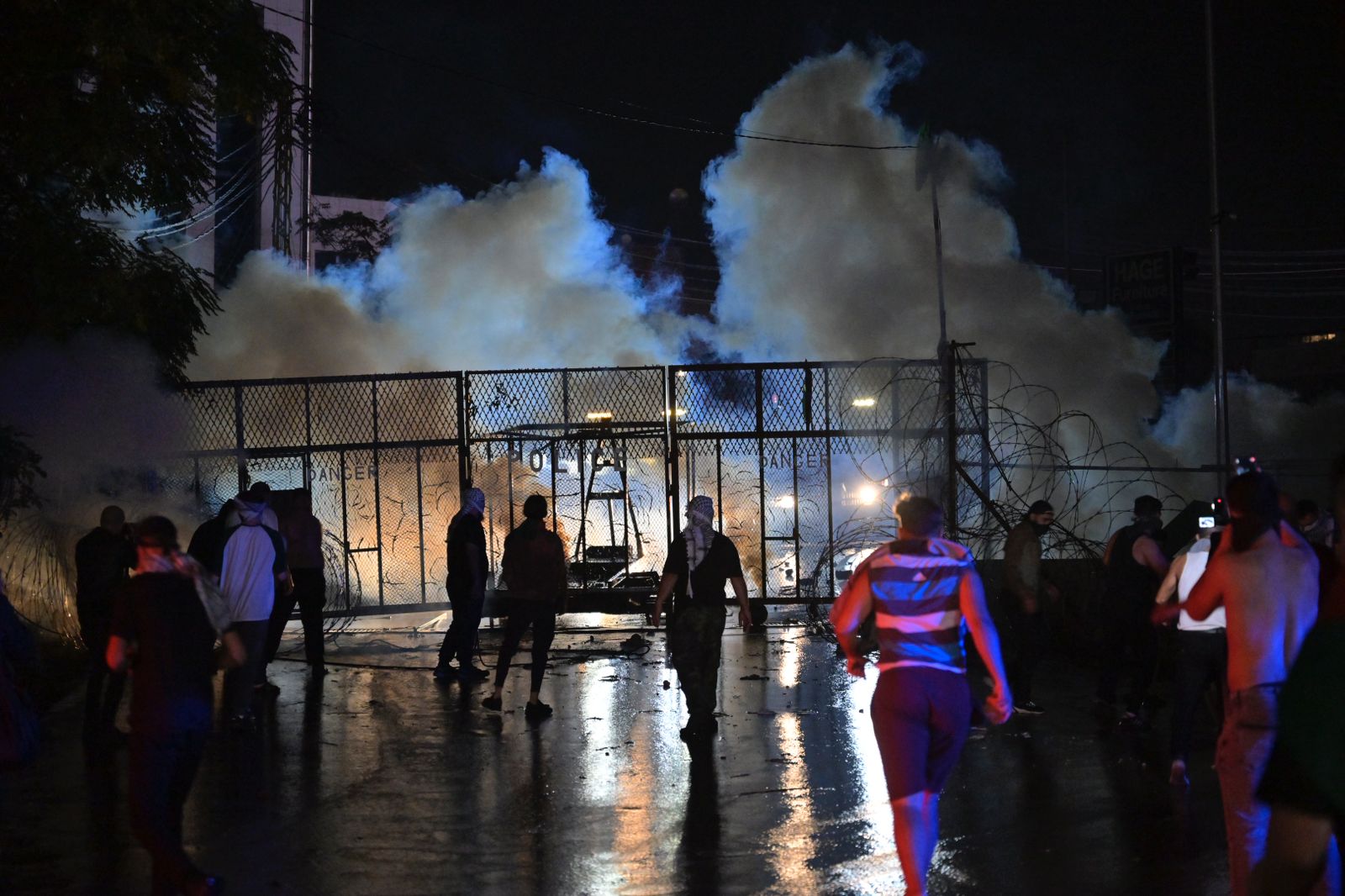 كما تمكن المحتجون من الوصول الى الأسلاك الشائكة ورفع علم فلسطين و”حماس” على الجدار الحديدي للسفارة.