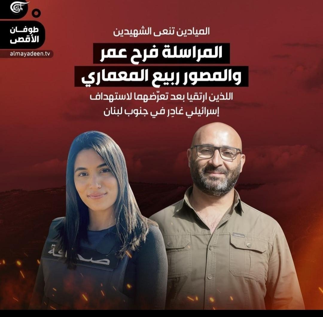 استهدف العدو الاسرائيلي الجسم الصحافة خصوصا من ينقلون الصورة الحقيقية ويكشف اجرامهم، وكالعادة طالت بد الهمجية والغدر قناة الميادين التي نعت الشهيدين المراسلة فرح عمر والمصور ربيع المعماري نتيجة استهداف إسرائيلي غاِدر جنوبي لبنان