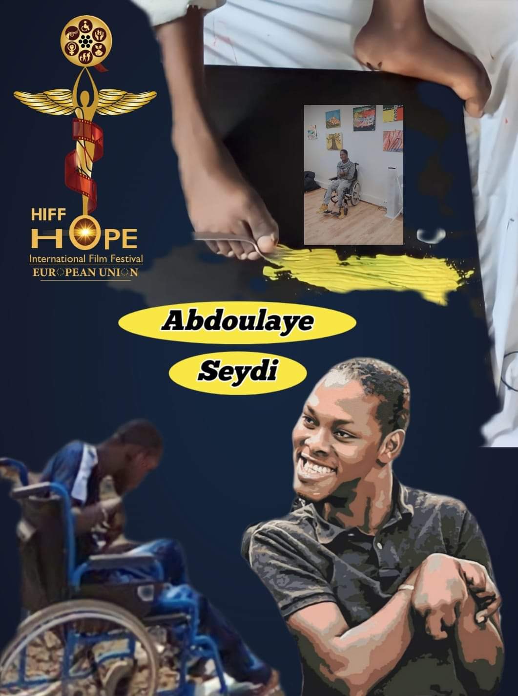 كما يحل الفنان والرسام السنغالي عبدالله سيدي ضيفا على حفلة الافتتاح، وهو الفنان الذي تحدى الإعاقة وابدع بالرسم بقدميه، وأثبت للعالم في مهرجان كان السينمائي أنه حالة فريدة ومتميزة وحصل على التنويه والترحيب الحار من نجوم العالم أجمع.