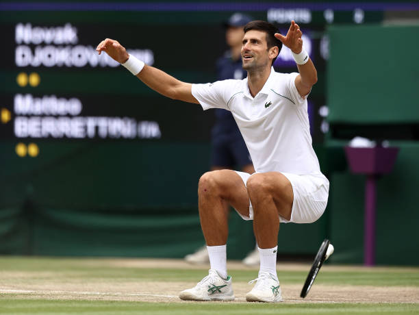 توّج الصربي نوفاك ديوكوفيتش المصنف أوّل عالميًا بلقبه السادس في بطولة ويمبلدون لكرة المضرب وعادل الرقم القياسي لعدد الألقاب في البطولات الكبرى (20)، بفوزه اليوم الأحد على الإيطالي ماتيو بيريتيني التاسع بعد أن عوّض تأخره بمجموعة إلى فوز مثير 6-7 (4/7)، 6-4، 6-4، 6-3.