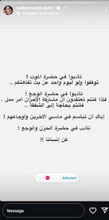 وكانت نادين تعرضت لموجة من الانتقادات بعد نشرها صوراً لها من مناسبات إجتماعية بالتزامن مع ما حدث من تفجيرات يومي الثلائاء والأربعاء.