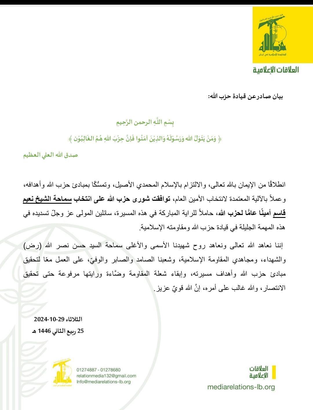 صدر عن قيادة “حزب الله “البيان الاتي:” انطلاقًا من الإيمان بالله تعالى، والالتزام بالإسلام المحمدي الأصيل، وتمسُّكًا بمبادئ حزب الله وأهدافه، وعملاً بالآلية المعتمدة لانتخاب الأمين العام، توافقت شورى حزب الله على انتخاب سماحة الشيخ نعيم قاسم أمينًا عامًّا لحزب الله، حاملاً للراية المباركة في هذه المسيرة، سائلين المولى عز وجلّ تسديده في هذه المهمة الجليلة في قيادة حزب الله ومقاومته الإسلامية.