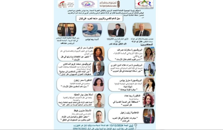 تنظم رئيسة “الجمعية اللبنانية للتجديد التربوي والثقافي الخيرية” Alrec ريما يونس، الجمعة في 13 الحالي، السابعة مساء، عبر تطبيق “زوم”، بالتعاون مع المجلس الوطني للإعلام المرئي والمسموع برئاسة عبد الهادي محفوظ وأكاديمية طلال أبو غزاله للتأهيل الرقمي والمنتدى العربيّ لدراسات المرأة والتدريب حلقة نقاشية دولية بعنوان “سبل الدعم النفسي والتربوي ما بعد الحرب على لبنان” مع نخبة من الأكاديميين والمثقفين: البروفيسورة سكارلت صراف، البروفسورة إسراء علاء الدين نوري، البروفسور محمد كريم الساعدي، البروفسورة ماريز يونس، الدكاترة: سمر الزغبي، سمر زيتون وريما حداد، الإعلامية زينب زعيتر، جان بيار الحايك، ومارون خياط.