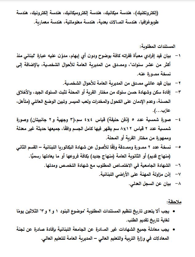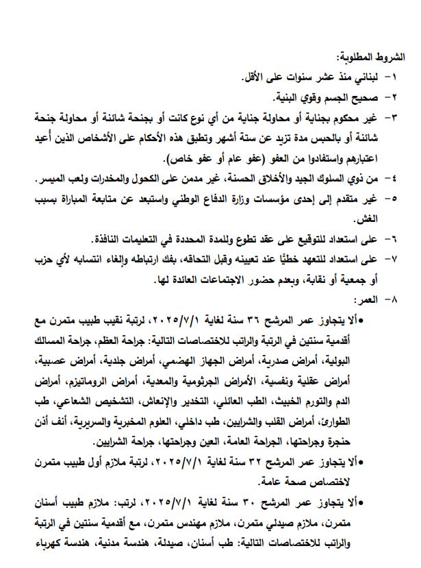 أعلنت وزارة الدفاع الوطني – قيادة الجيش حاجتها إلى تعيين ضباط اختصاصيين في مجالات الطب والصيدلة والهندسة بطريقة المباراة من بين المدنيين (ذكورًا وإناثًا).