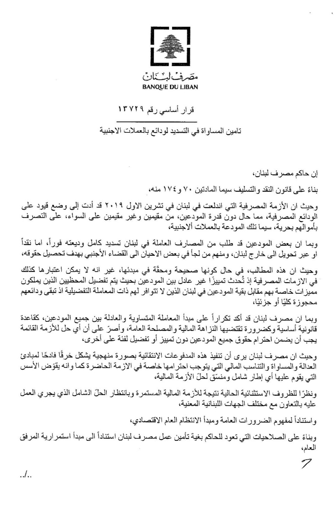 اصدر مصرف لبنان تعميمًا جديدًا يحمل الرقم 169 يهدف الى المساواة بين المودعين ويمنع المصارف من تحويل اي وديعة الى الخارج دون اذن مسبق من مصرف لبنان.