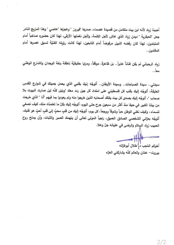 وجه الدكتور طلال أبو غزالة برقية تعزية، أفاض فيها عن حقيقة مشاعره، وما يراه فيها كسيدة راقية كبيرة بكل المواصفات والصفات، وأم ثابتة على أمومتها، وفي زياد الرحباني الصفات العبقرية والانسانية الراقية.
