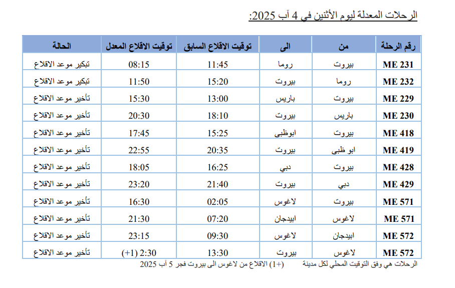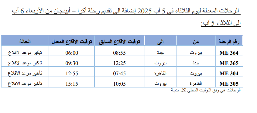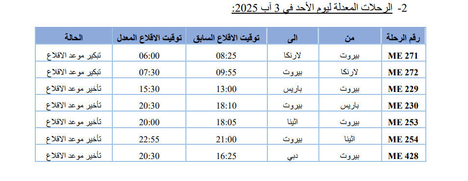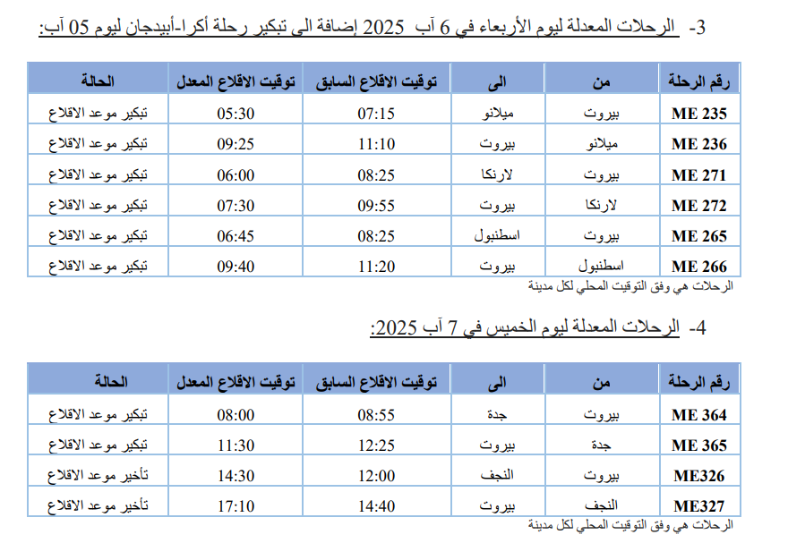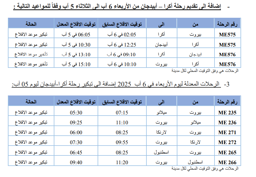 أعلنت شركة طيران الشرق الأوسط – الخطوط الجوية اللبنانية، أنها ستجري تعديلات إضافية على بعض رحلاتها المجدولة خلال الفترة من السبت 2 آب حتى الخميس 7 آب 2025، وذلك لأسباب تشغيلية. وتشمل التعديلات رحلات من وإلى باريس، ميلانو، الكويت، النجف، أبوظبي، ودبي، إضافة إلى وجهات أخرى.
