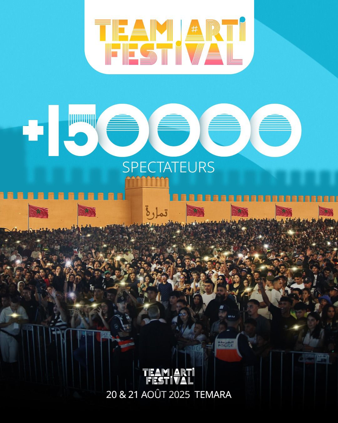 سجل مهرجان تيم آرتي للراب في المغرب نجاحاً غير مسبوق في نسخته الرابعة، بعد أن استقطب حضوراً جماهيرياً تاريخياً تجاوز 150 ألف متفرج، في أجواء احتفالية ضخمة عاشتها مدينتا تمارة وهرهورة على مدار أيام المهرجان.