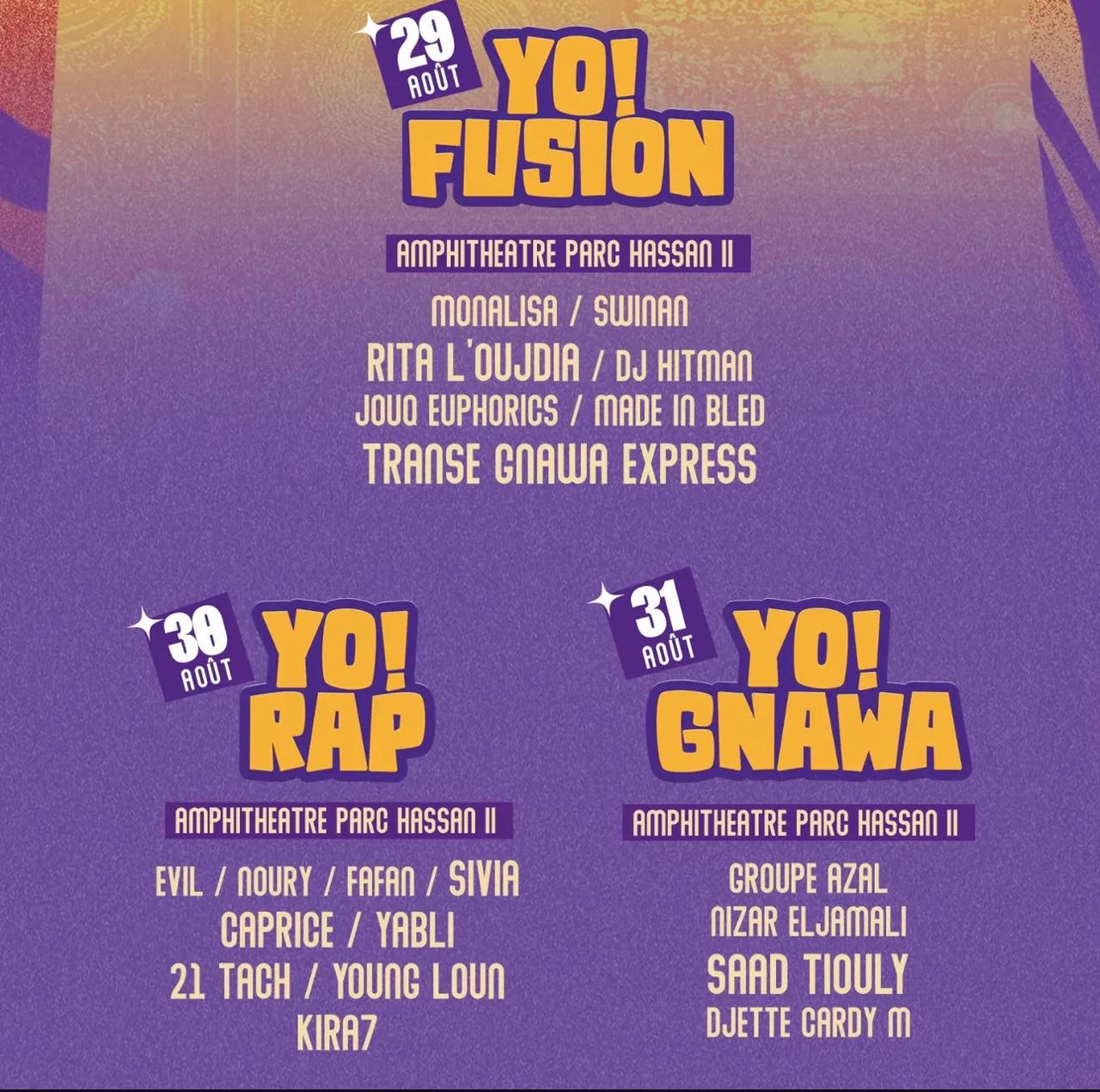 وتفتتح فعاليات الحفلات الجماهيرية بحفلة فرقة “ترانس جناوة اكسبريس” والفنانة غيتة الوجدية وفرقة الفيوجن والروك “مايد ان بلاد” والفنانة موناليزا، في حين ترتكز ثاني لياليه على حفلات الهيب هوب بمشاركة عشرة من نجوم الراب من بينهم يابلي وكابريس ونوري ويانغ لون وكيراح.