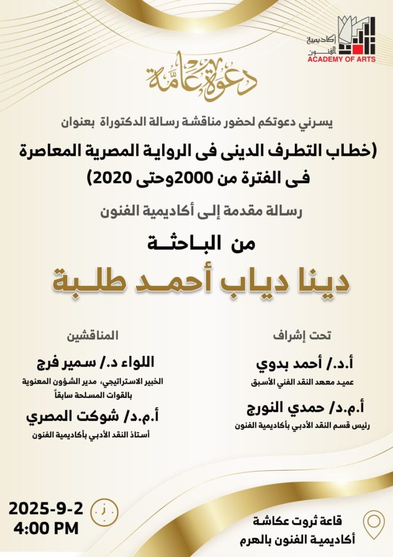 تناقش الكاتبة الصحافية دينا دياب رسالة الدكتوراه الخاصة بها غدًا الثلاثاء 2 سبتمبر، وذلك في قاعة ثروت عكاشة بأكاديمية الفنون. وتحمل الرسالة عنوان: “خطاب التطرف الديني في الرواية المصرية المعاصرة في الفترة من 2000 وحتى 2020.. دراسة تحليلية نقدية”.