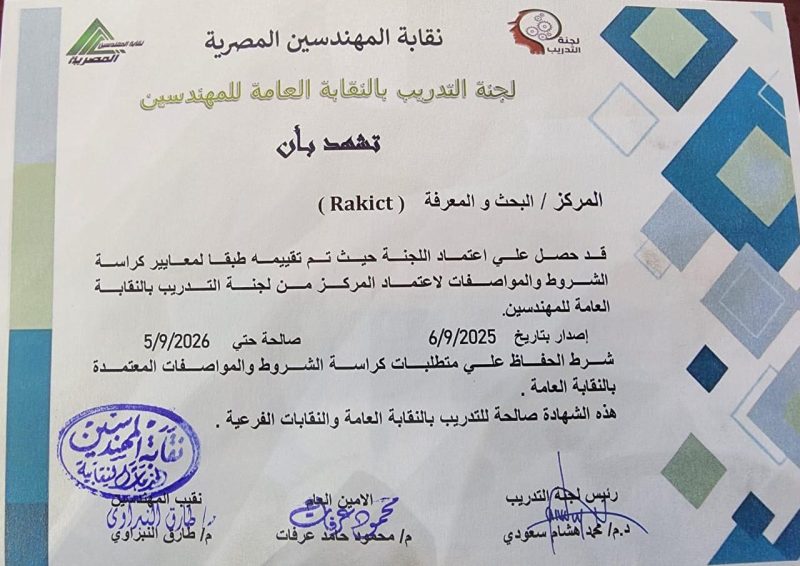 شركة “RAKICT” تحصل على اعتماد نقابة المهندسين المصرية كمركز تدريب معتمد