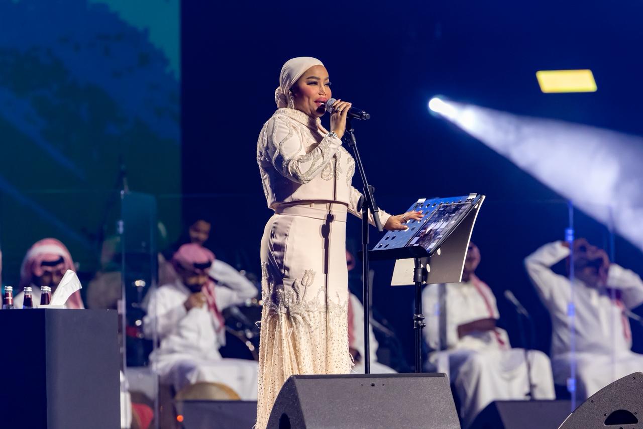 واستهلت الفنانة موضي الشمراني فقرتها بأغنية وطنية أشعلت حماس الجمهور، واختتمت أيضًا بأغنية وطنية وسط تفاعل واسع وتصفيق حار، في أداء جسّد روح الفخر والانتماء.