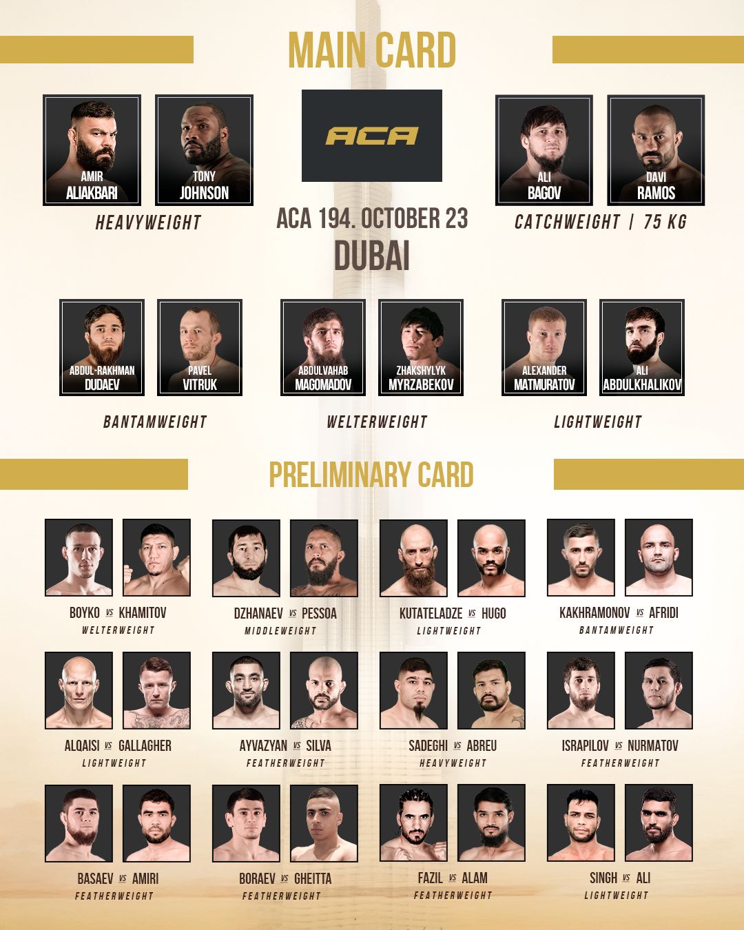 تستعد دبي لاستقبال واحدة من أضخم وأهم بطولات الفنون القتالية في العالم، حيث تُقام يوم 23 أكتوبر الجاري النسخة رقم 194 من بطولة «أخمات» (ACA) الروسية العالمية للفنون القتالية المختلطة، والتي تُعد من أبرز المنظمات الترويجية على الساحة الأوروبية والعالمية في رياضات الـMMA والكيك بوكسينغ والجوجيتسو البرازيلية، وذلك في صالة «ذا أجندة» في قلب دبي.