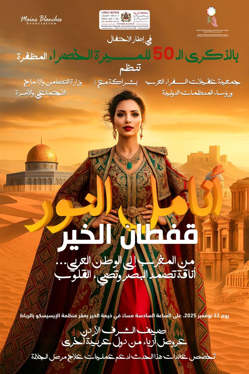 في إطار الاحتفال بالذكرى الخمسين للمسيرة الخضراء المظفرة، تستعد مدينة الرباط، بخيمة الخير في مقر منظمة الإيسيسكو، يوم 22 نوفمبر، لاحتضان أمسية مميزة تجمع بين الأناقة المغربية والبعد الإنساني، من خلال حدث خيري تنظمه “جمعية عقيلات السفراء العرب ورؤساء المنظمات الدولية”، بشراكة مع وزارة التضامن والإدماج الاجتماعي وجمعية الأيادي البيضاء.