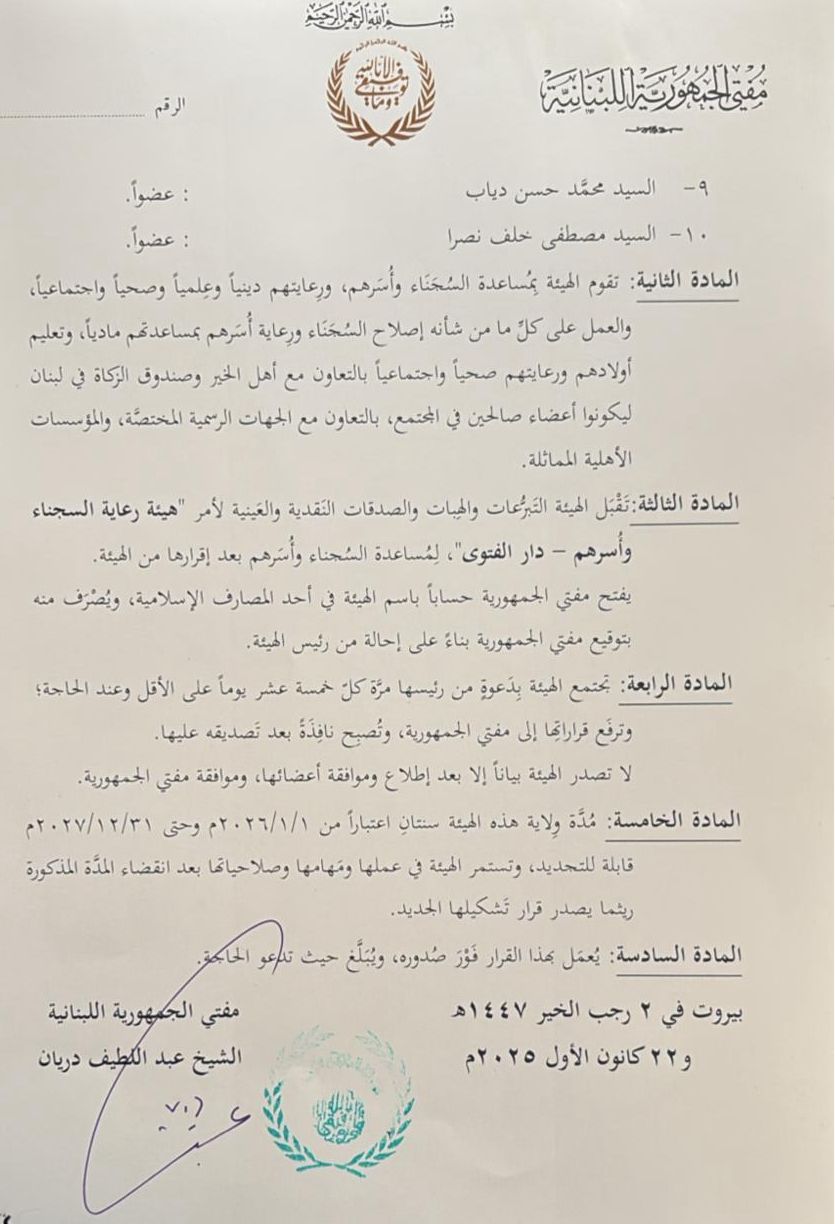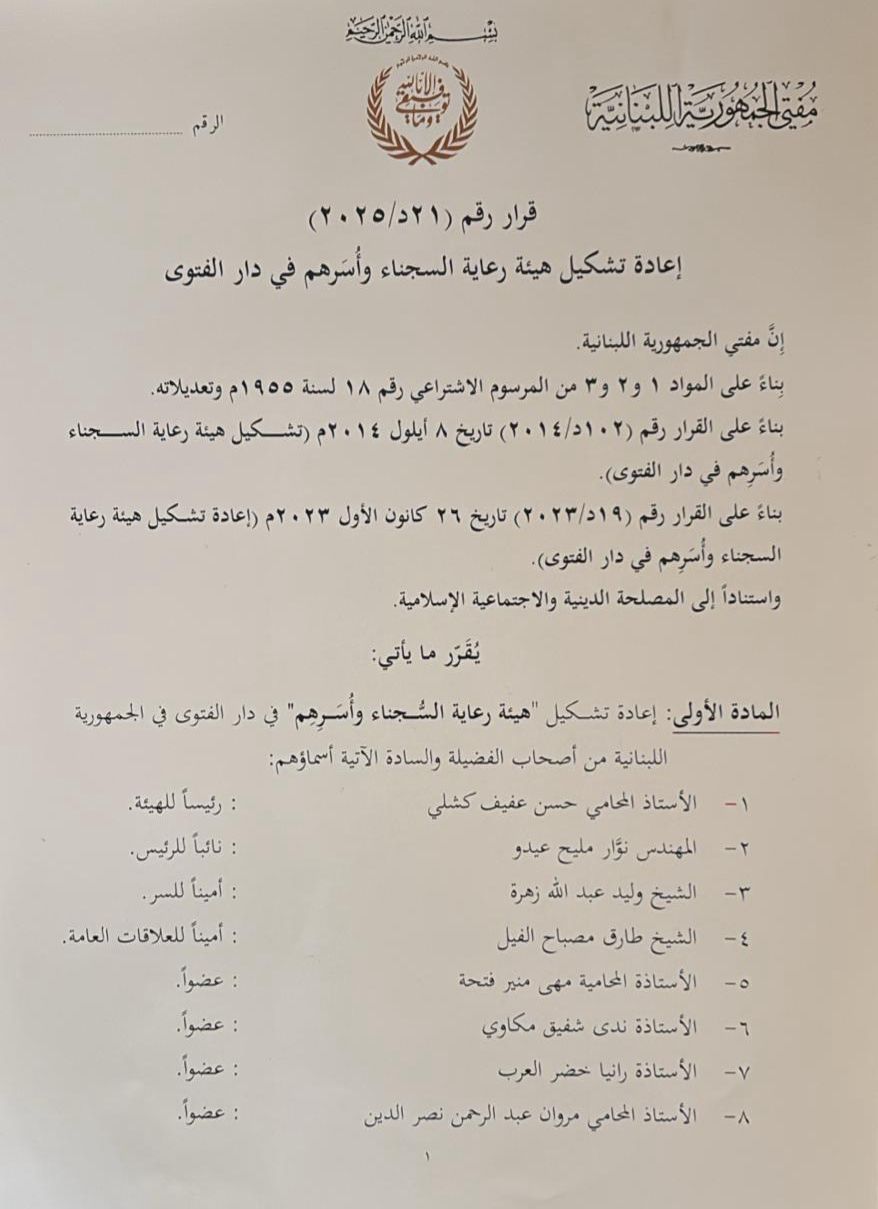 اصدر مفتي الجمهورية اللبنانية الشيخ عبد اللطيف دريان قرارا بتشكيل هيئة رعاية السجناء وأُسَرهم في دار الفتوى من السادة الآتية أسماؤهم: المحامي حسن عفيف كشلي رئيساً للهيئة، المهندس نوَّار مليح عيدو نائباً للرئيس، الشيخ وليد عبد الله زهرة أميناً للسر، الشيخ طارق مصباح الفيل أميناً للعلاقات العامة، والأعضاء: المحامية مهى منير فتحة، المحامي مروان عبد الرحمن نصر الدين، الأستاذة ندى شفيق مكاوي، الأستاذة رانيا خضر العرب، السيد محمَّد حسن دياب، السيد مصطفى خلف نصرا.
