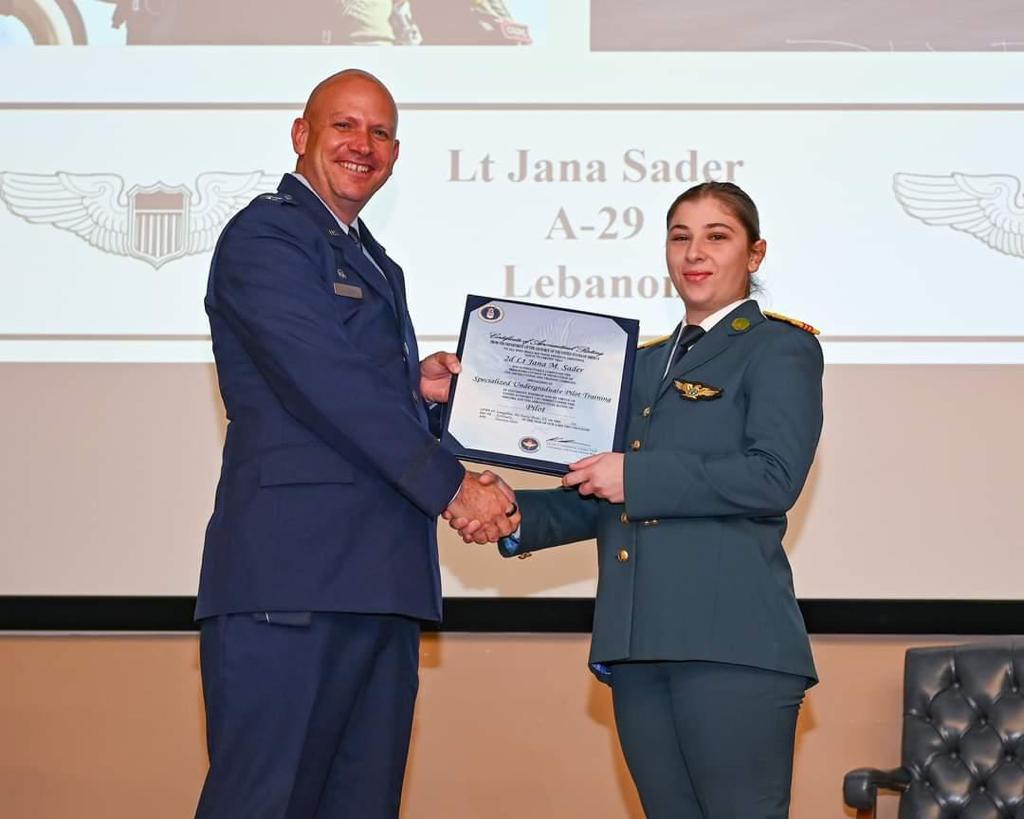 وقال الجيش اللبناني في تغريدة على “تويتر”: “تخرجت التلميذ الضابط جنى صادر من الجيش اللبناني من Laughlin Air Force Base في ولاية Texas الأمريكية بعدما تابعت دورة لمدة سنتين تقريبا لتكون أول امرأة في الجيش تبدأ مسيرتها المهنية بطائرة القتال الهجومية سوبر توكانو A-29”.