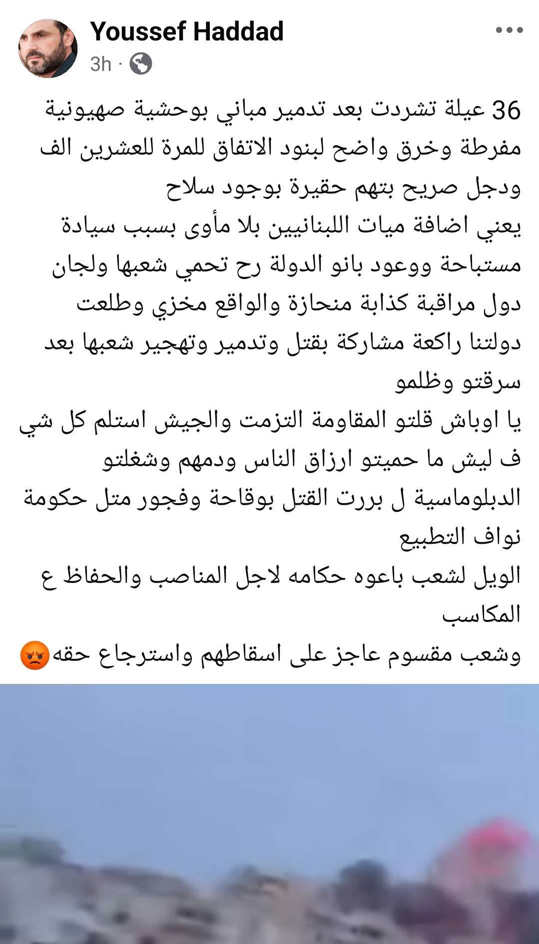 نشر النجم اللبناني يوسف حداد عبر صفحته على موقع فيسبوك رسالة شديدة اللهجة عبّر فيها عن غضبه إزاء تشرّد 36 عائلة لبنانية بعد تدمير مبانٍ سكنية في الجنوب، واصفاً ما جرى بأنه “وحشية صهيونية مفرطة” و“خرق واضح للاتفاق”.
