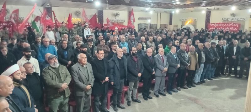 كلمة الجبهة الديمقراطية لتحرير فلسطين القاها نائب رئيس المجلس الوطني الفلسطيني ونائب الأمين العام للجبهة الرفيق علي فيصل: الذي استعرض مسيرة الجبهة النضالية منذ انطلاقتها على مختلف المستويات في أعمال المقاومة والمبادرات السياسية والريادة في الحركة الجماهيرية والفكر السياسي الفلسطيني والثوري، مؤكداً أن الشعب الفلسطيني نجح بصموده ووعيه في إعادة قضيته إلى موقعها الطبيعي كقضية تحرر وطني. وأن الجبهة الديمقراطية تستمد قوتها من تضحيات الشعب الفلسطيني في غزة والضفة والشتات. واكد أن صمود الشعب والمقاومة في مواجهة حرب الإبادة يدلل على إمكانية هزيمة المشروع الصهيوني. وان قطاع غزة سيبقى فلسطينيا وجزءا من الدولة الفلسطينية المستقلة، داعيا الوسطاء والاطراف الضامنة الى تحمل مسؤولياتها، باجبار الاحتلال على وقف عدوانه وتمكين اللجنة الوطنية لإدارة غزة من اداء دورها، في اطار مرجعية منظمة التحرير الفلسطينية الممثل الشرعي والوحيد لشعبنا، وبما يُمهد لاطلاق عملية الاعمار الشامل في القطاع وانسحاب الاحتلال بشكل كامل. واضاف قائلا: إن المشروع الإسرائيلي يستهدف مختلف عناوين القضية الفلسطينية، وفي مقدمتها قضية اللاجئين، التي تتعرض لهجوم إسرائيلي وأميركي واضح. وهذا يفرض على حركتنا الوطنية ضرورة امتلاك برنامج عمل موحد للدفاع عن حق العودة وصون قضية اللاجئين، ودعم وكالة الأونروا بالموارد المالية اللازمة لأداء دورها، والتصدي لتدمير مخيمات الضفة وغزة وتهجير ابنائها. ودعا الى مواجهة هذه التحديات بصياغة استراتيجية وطنية فلسطينية شاملة، قادرة على التصدي لكل المخاطر التي تستهدف اللاجئين وحقهم بالعودة الى ديارهم وممتلكاتهم. وشدد فيصل بان طريق الخلاص يبدأ بتفعيل مؤسسات منظمة التحرير وتعزيز دورها التمثيلي، وعقد مجلس مركزي وانتخاب لجنة تنفيذية جديدة بمشاركة الجميع، ووضع استراتيجية نضالية شاملة لقيادة معركة التحرر الوطني، وتعزيز وحدة الميدان في مواجهة تداعيات حرب الابادة في غزة ومخطط الضم في الضفة، واستنهاض طاقات الشعب الفلسطيني، وتوسيع الدعم العربي والدولي لقضيته. لمواجهة مشروع نتنياهو لبناء دولة اسرائيل وهندسة خارطة المنطقة بالشراكة الامريكية الاستعمارية لبناء شرق اوسط جديد. والتصدي للتمييز العنصري والجريمة المنظمة في الاراضي المحتلة عام ١٩٤٨. وشدد فيصل بان الرهان يجب ان يكون على الشعب الفلسطيني وصموده وثباته ومقاومته وعلى دعم شعوب المنطقه واحرار العالم وليس على الوعود الامريكية، وعزل دولة اسرائيل وسحب الاعتراف بها ومقاطعتها على مختلف الصعد. واكد اصرار الشعب الفلسطيني على مواصلة كفاحه لتحقيق اهدافه في العوده وتقرير المصير واقامة الدولة الفلسطينية المستقلة وعاصمتها القدس على كامل الاراضي المحتلة حتى حدود الرابع من حزيان عام ١٩٦٧. وقدر فيصل عاليا الحراك الشعبي الدولي وجبهة العدالة الدولية، ودعا لاتساع دائرته ودائرة المقاطعة الاقتصاية ومناهضة الاحتلال. وحيا قوى المقاومة في المنطقة، وادان الاعتداء على فنزويلا وخطف رئيسها وتصعيد الحصار ضد كوبا وحشد الاساطيل لاستهداف ايران. كما حيا لبنان ومقاومته وتضحيات شعبه دفاعا عن القضية الفلسطينية، واكد التزام الشعب الفلسطيني بالسيادة اللبنانية، ودعا للتعاطي مع المخيمات باعتبارها بيئة سياسية ونضالية وليست امنية، وجدد الدعوة لتوحيد الموقف الفلسطيني في لبنان وتنظيم تحركات جماهيرية موحدة، والعمل على تنظيم العلاقات الفلسطينية اللبنانية على اسس سياسية وقانونية واقتصادية وامنية، بما يضمن اقرار الحقوق الانسانية والحفاظ على الاونروا وصيانة امن واستقرار المخيمات دعما لنضال اللاجئين من اجل حق العودة وافشال مخطط التوطين والتهجير، ودعا لاستكمال اعمار مخيم نهر البار والتعويض على العائلات واعمار المباني المهدمة وانصاف العائلات في الجزء الجديد منه، والمهجرين الفلسطينيين من سوريا.