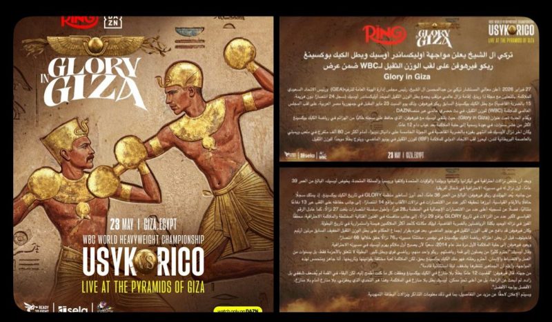 أعلن المستشار تركي آل الشيخ عن إقامة نزال عالمي مرتقب يوم 23 مايو 2026 في مصر، يقام على سفح الاهرامات ويجمع بطل العالم في الوزن الثقيل الموحّد أوليكساندر أوسيك مع بطل الكيك بوكسينغ ريكو فيرهوفن على لقب (WBC) للوزن الثقيل، ضمن عرض Glory in Giza وبث حصري عالمي عبر منصة DAZN.