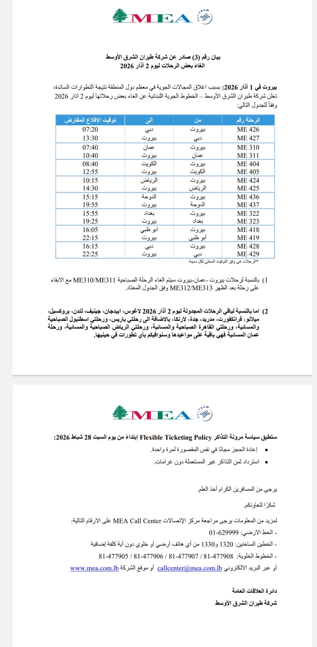 أعلنت شركة طيران الشرق الأوسط، في بيان، إلغاء بعض الرحلات ليوم 2 آذار 2026.