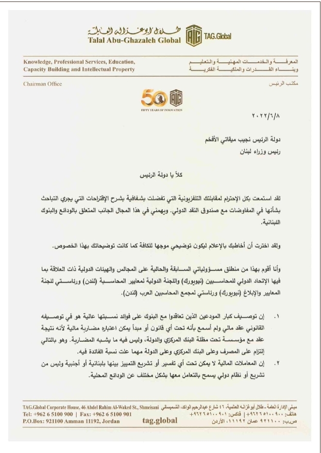 وجه الدكتور طلال أبو غزاله رسالة الى رئيس الحكومة اللبنانية نجيب ميقاتي وقف فيها على بعض النقاط التي طرحت في لقاء ميقاتي التلفزيوني حول مفاوضات لبنان مع صندوق النقد الدولي.