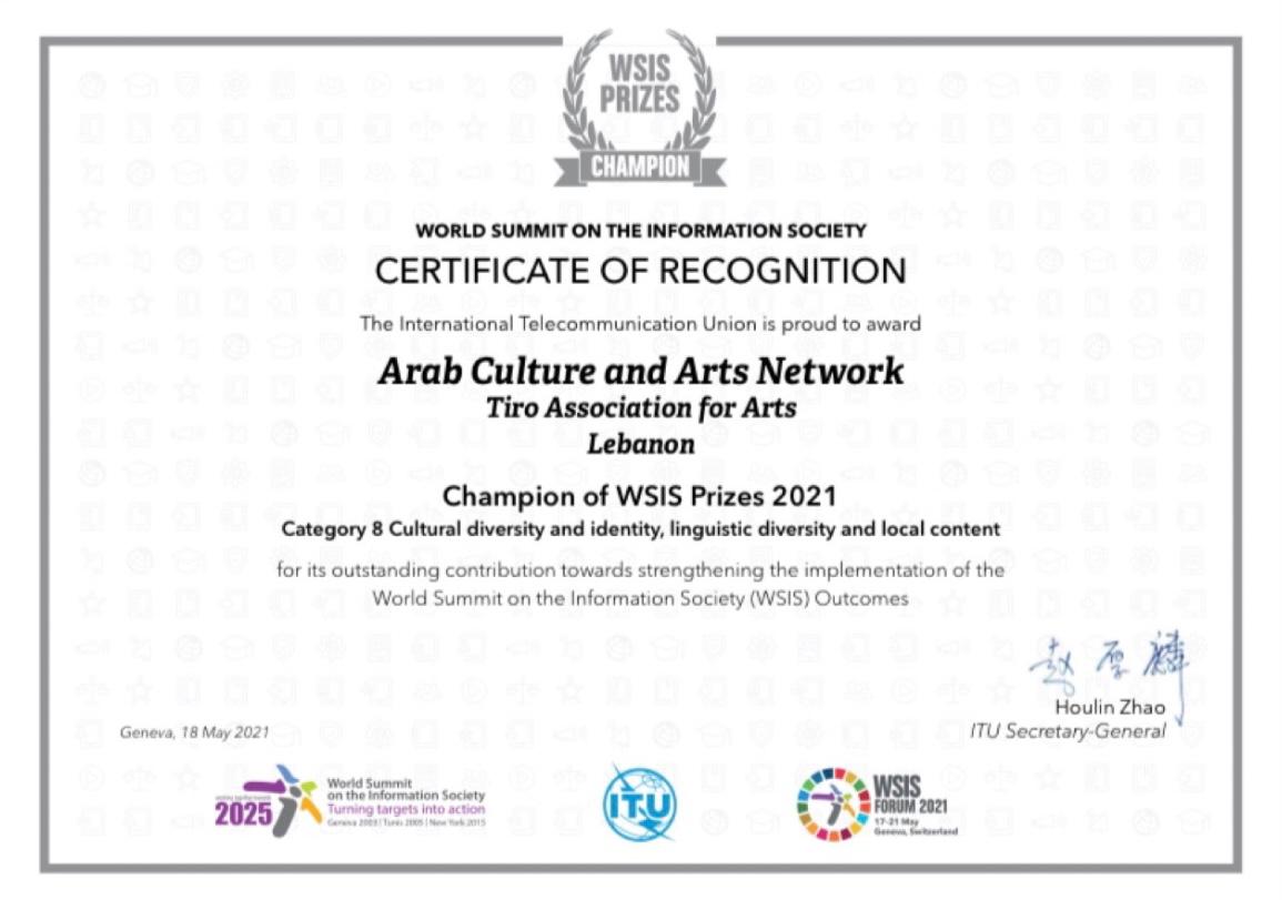 فاز مشروع شبكة الثقافة والفنون العربية من لبنان بمسابقة جوائز القمة العالمية لمجتمع المعلومات 2021 ضمن فئة التنوع الثقافي والهوية والتنوع اللغوي والمحتوى المحلي مع مشاريع من روندا وبنغلادش والهند واستراليا كأفضل خمس مشاريع على مستوى العالم من بين 1270 من المشاريع المقدَّمة من مختلف دول العالم، تم ترشيح 360 مشروعاً؛ 20 في كل فئة من فئات خط العمل الـ18 التابعة للقمة العالمية لمجتمع المعلومات، وقد فازت المشاريع الخمسة من ضمن التصويت عبر الإنترنت ب 1.3 مليون صوت ، ونالت روندا المرتبة الأولى.