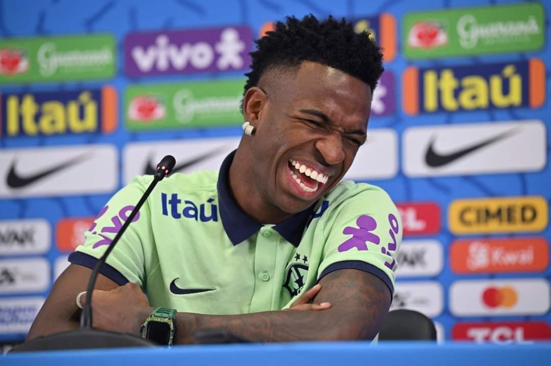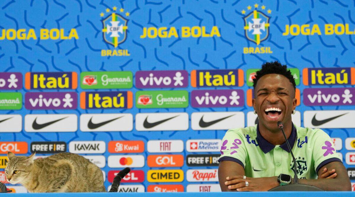 قطة تقتحم المؤتمر الصحفي لمنتخب البرازيل وسط ضحكات فينيسيوس جونيور