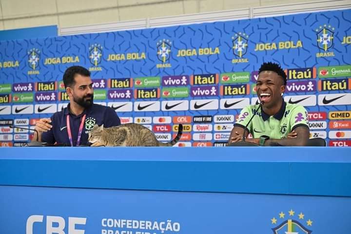 في لقطة طريفة ومفاجئة اقتحمت قطة المؤتمر الصحفي الخاص بمنتخب البرازيل الذي أقيم ظهر هذا اليوم بحضور اللاعب فينيسيوس جونيور.