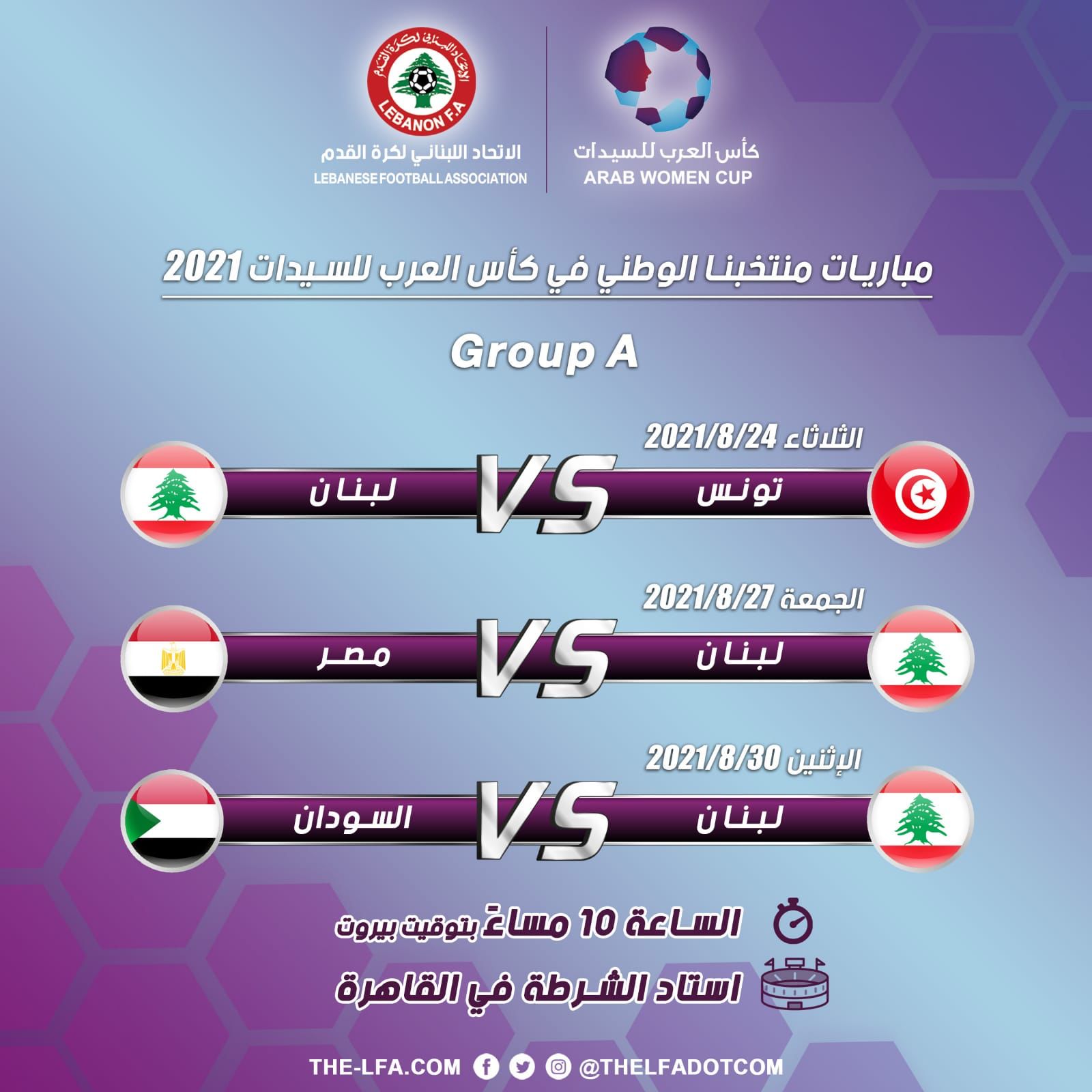 وكانت قرعة البطولة التي تقام جميع مبارياتها على ملعب الشرطة بالقاهرة، أسفرت عن وقوع لبنان الى جانب مصر وتونس والسودان في المجموعة الأولى، بينما جاءت منتخبات الأردن والجزائر وفلسطين في المجموعة الثانية.