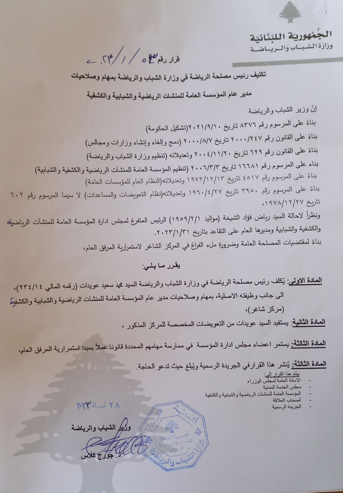 بموجب القرار رقم ٢٠٢٣/١/٥٣ تاريخ ٢٨ شباط ٢٠٢٣، كلّف وزير الشباب والرياضة الدكتور جورج كلّاس رئيس مصلحة الرياضة في الوزارة محمد عويدات مهام وصلاحيات مدير عام المؤسسة العامة للمنشآت الرياضية والشبابية والكشفية مع احتفاظه بمهامه الاصلية في الوزارة.